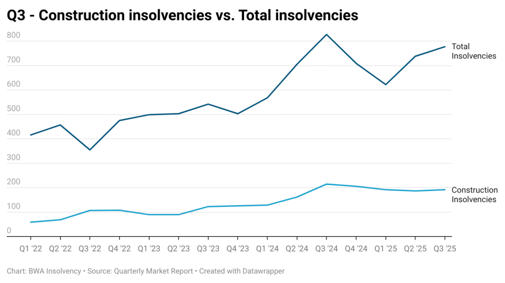 The BWA Insolvency Quarterly Market Report shows total insolvencies rose 5% from the previous quarter, increasing from 738 in Q2 to 777 in Q3. While this is 6% lower than the same period last year, the quarterly rise signals ongoing stress for businesses burdened by legacy debt and tighter credit conditions.