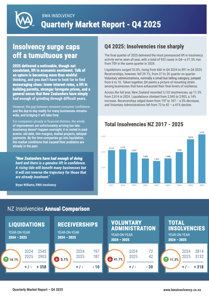 New Zealand experienced its highest level of business insolvencies since the Global Financial Crisis in 2025, according to the Q4 2025 Quarterly Market Report from BWA Insolvency. Read what BWA principal Bryan Williams has to say about the latest data.